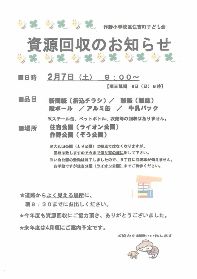 2/7 (土) 資源回収のお知らせ 作野小学校区こども会